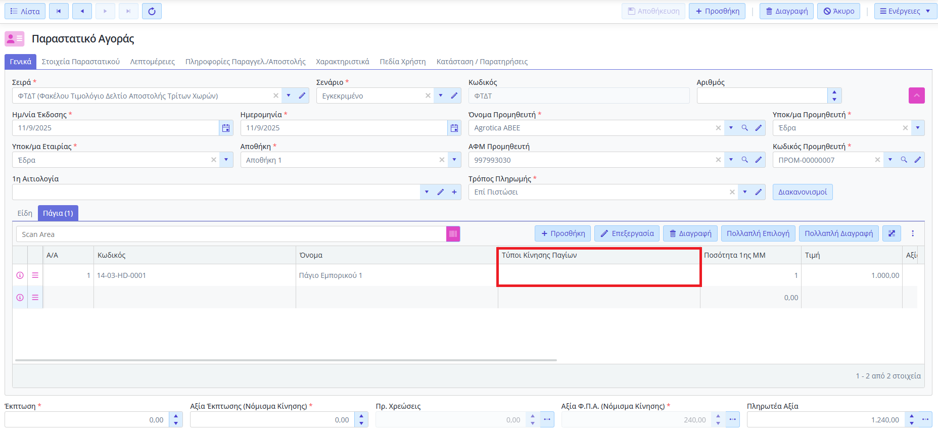 Δεν χρειάζεται να συμπληρώσετε στην γραμμή του παραστατικού αγοράς κίνηση παγίου.