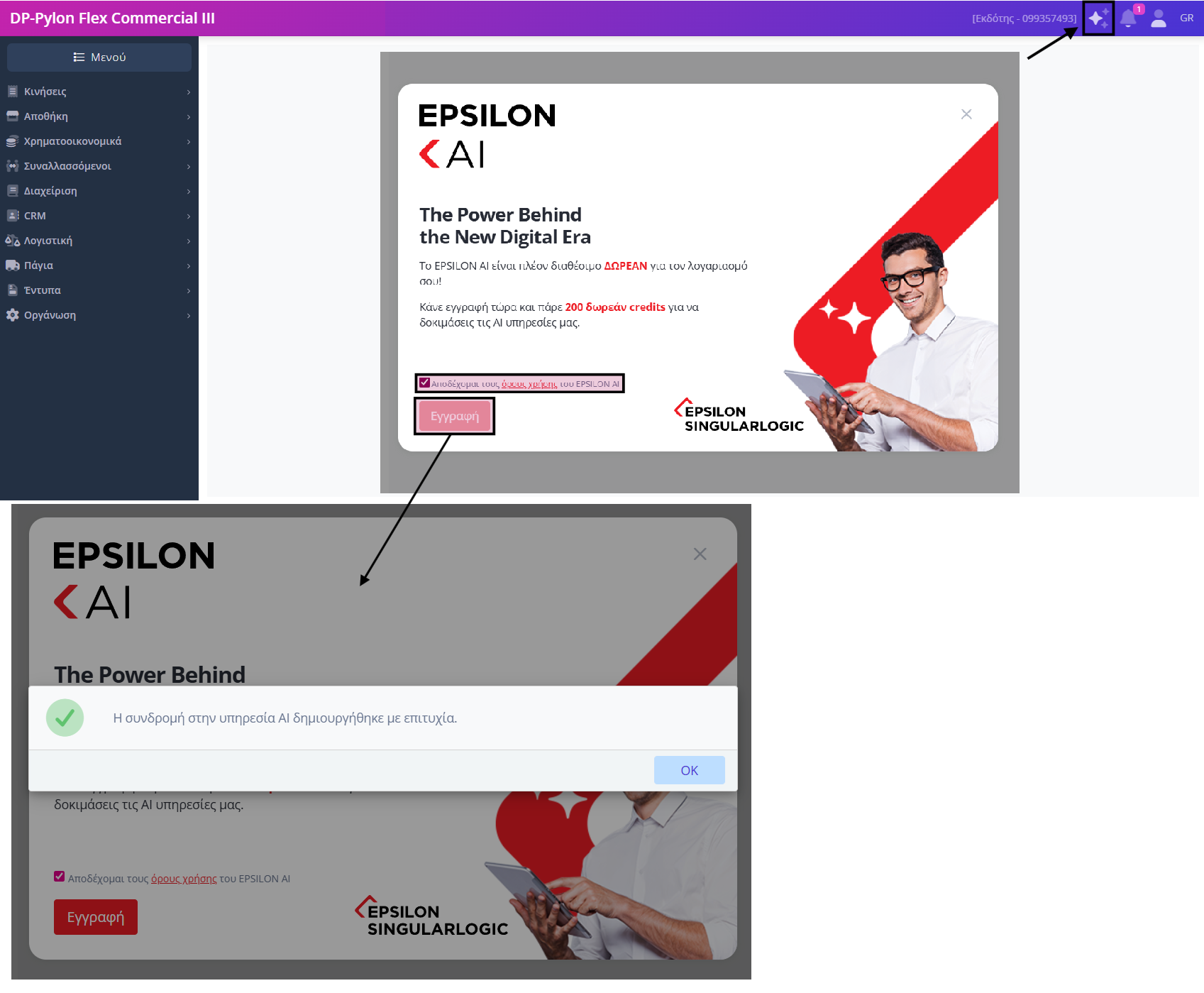 - στο παράθυρο που εμφανίζεται, αποδεχτείτε τους όρους χρήσης του Epsilon AI και πατήστε Εγγραφή,