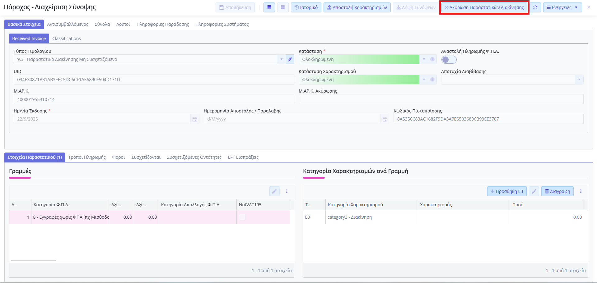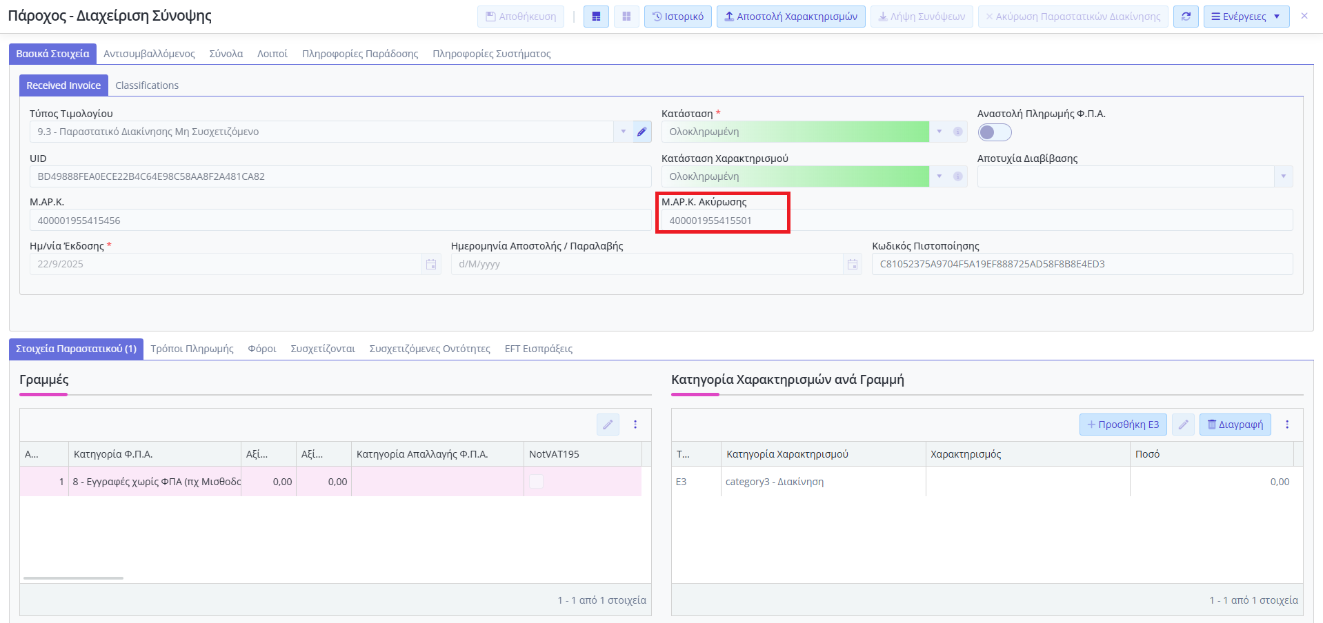 Όταν ένα παραστατικό ακυρωθεί (Εργασίες → Ακύρωση), στη σύνοψη του παρόχου επιστρέφεται και το ΜΑΡΚ Ακύρωσης.