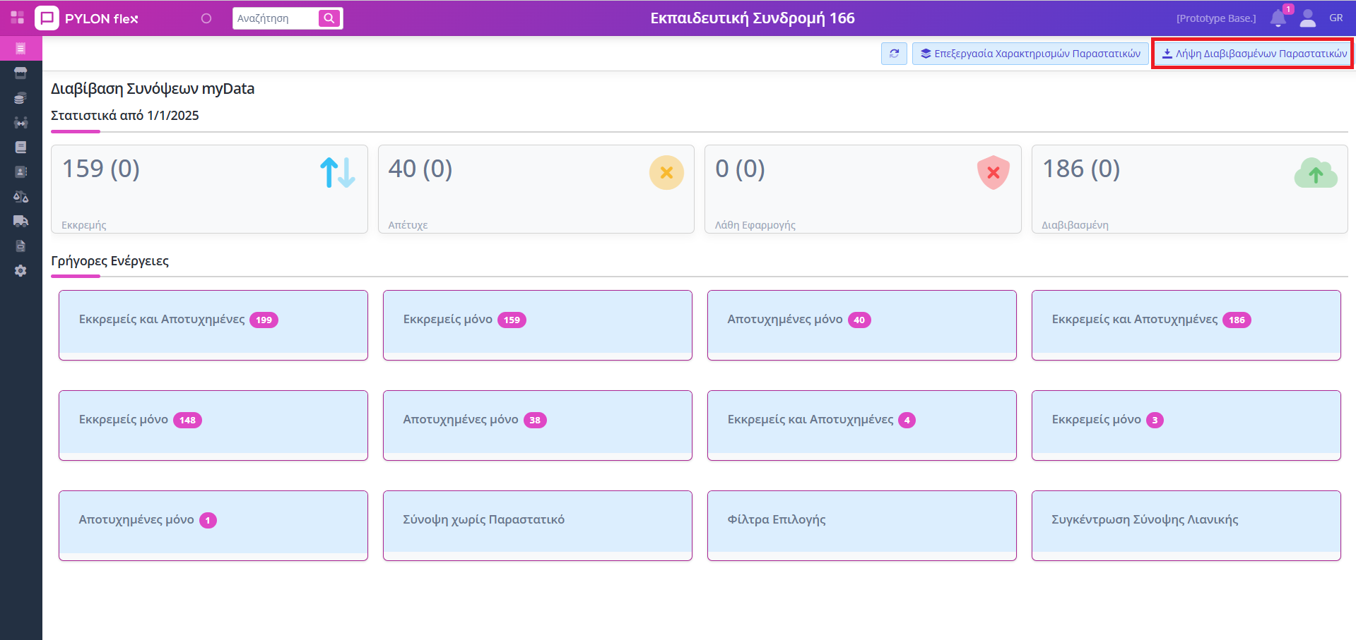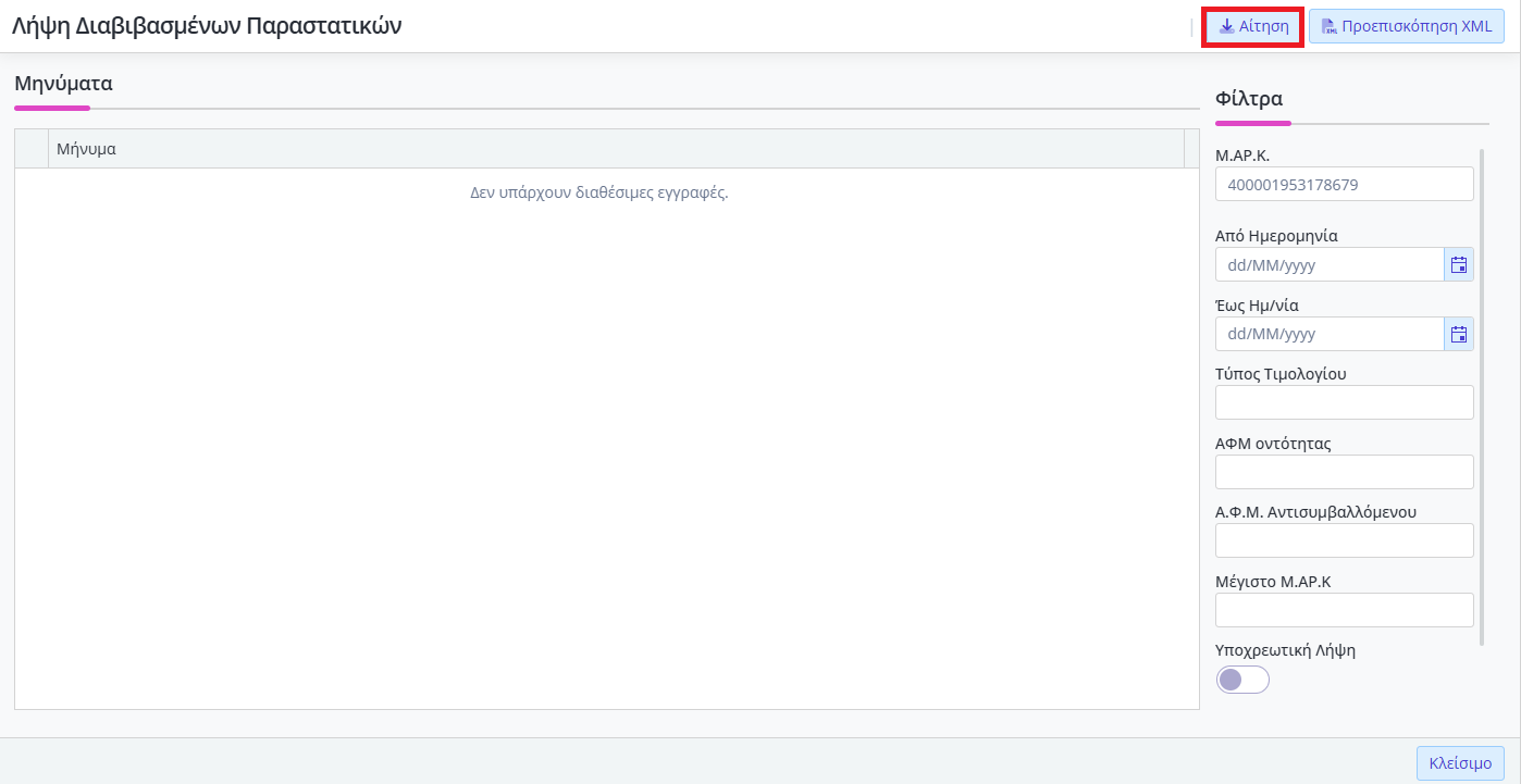 εμφανίζει σαν πληροφορία το τελευταίο διαβιβασθέν Mark από την εφαρμογή και πατώντας την λήψη, θα ενημερώσει αυτόματα τα παραστατικά των πωλήσεων για τα οποία έχει γίνει αλλαγή / ακύρωση εκτός εφαρμογής.