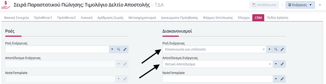 Οι πληροφορίες της ενέργειας CRM (Τύπος Εγγραφής, Υποκατηγορία, Ημερομηνία) που θα προκύψει, έχουν ορισθεί εντός της ροής ενέργειας που έχει επιλεχθεί στην σειρά.