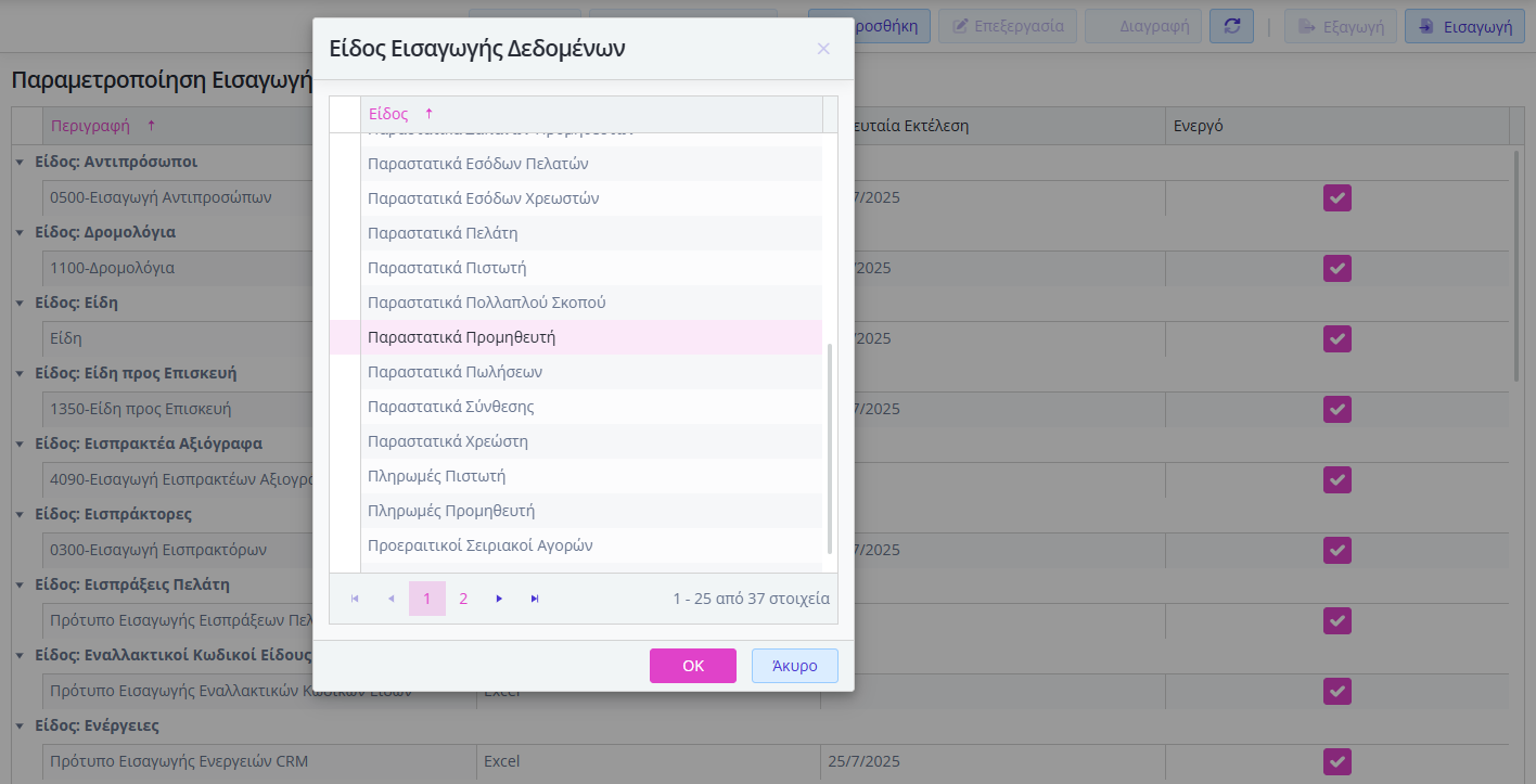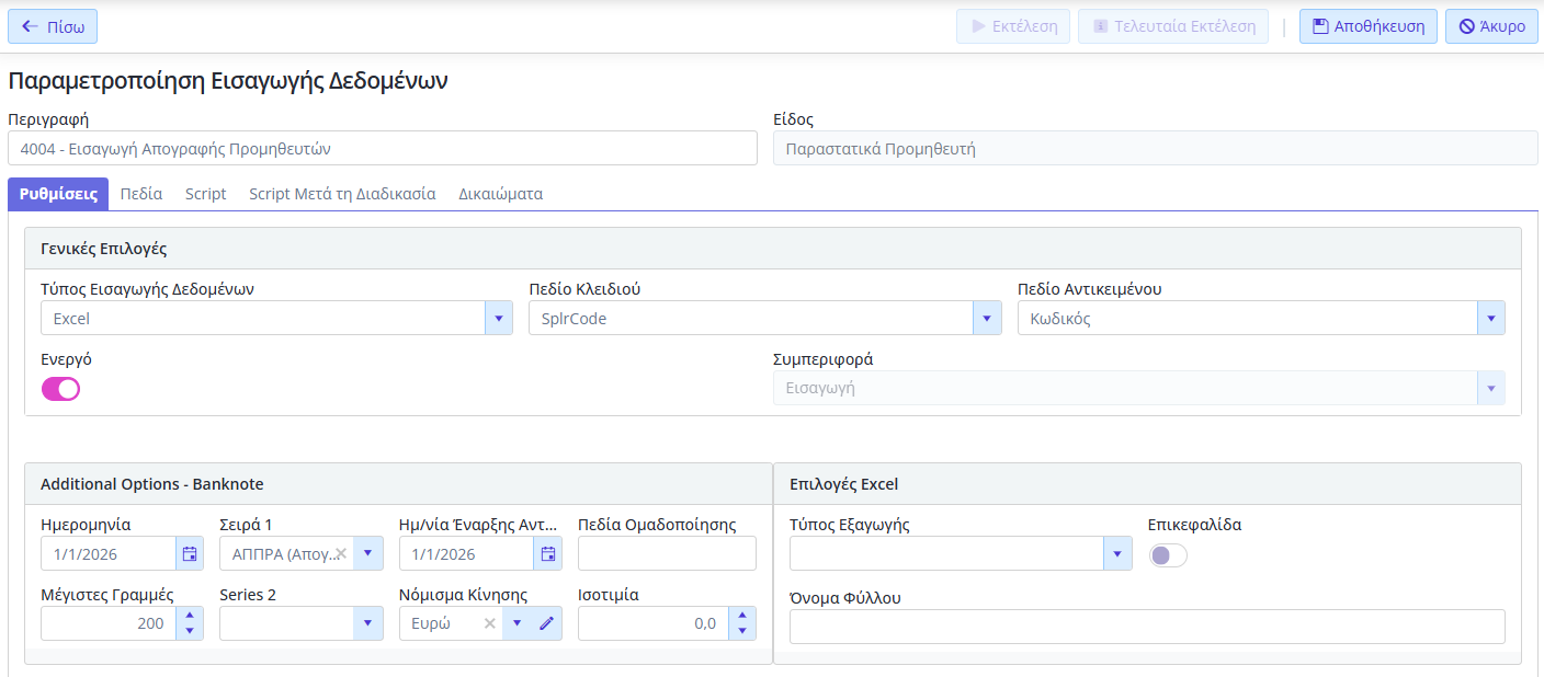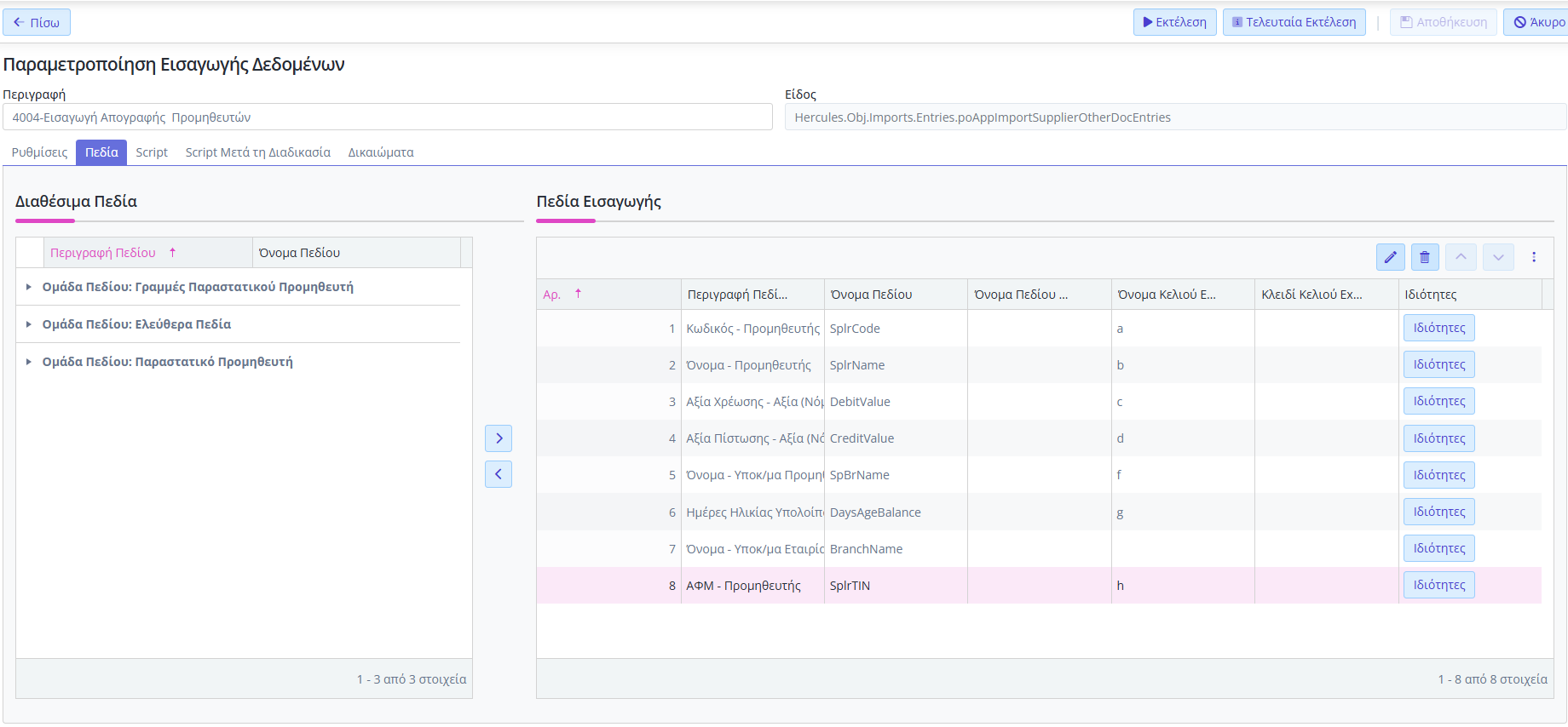 Για να πραγματοποιήσετε την εισαγωγή του αρχείου απογραφής προμηθευτών στην εφαρμογή, θα πρέπει να δημιουργήσετε ένα σενάριο εισαγωγής. Εργαστείτε ως εξής: