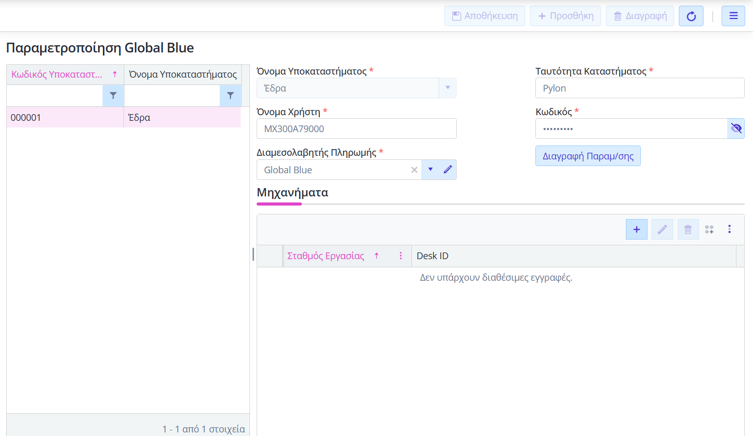 • επιλέξτε Παραμετροποίηση Global Blue (Οργάνωση → Υποδομή → Λοιπά), όπου ορίζετε ανά Υποκατάστημα την Ταυτότητα Καταστήματος, το Όνομα Χρήστη, τον Κωδικό, τον Διαμεσολαβητή Πληρωμών, καθώς και τα Μηχανήματα τα οποία θα συνδέονται με το δικό τους αναγνωριστικό (Desk ID).