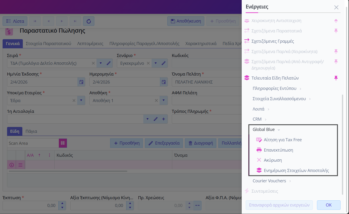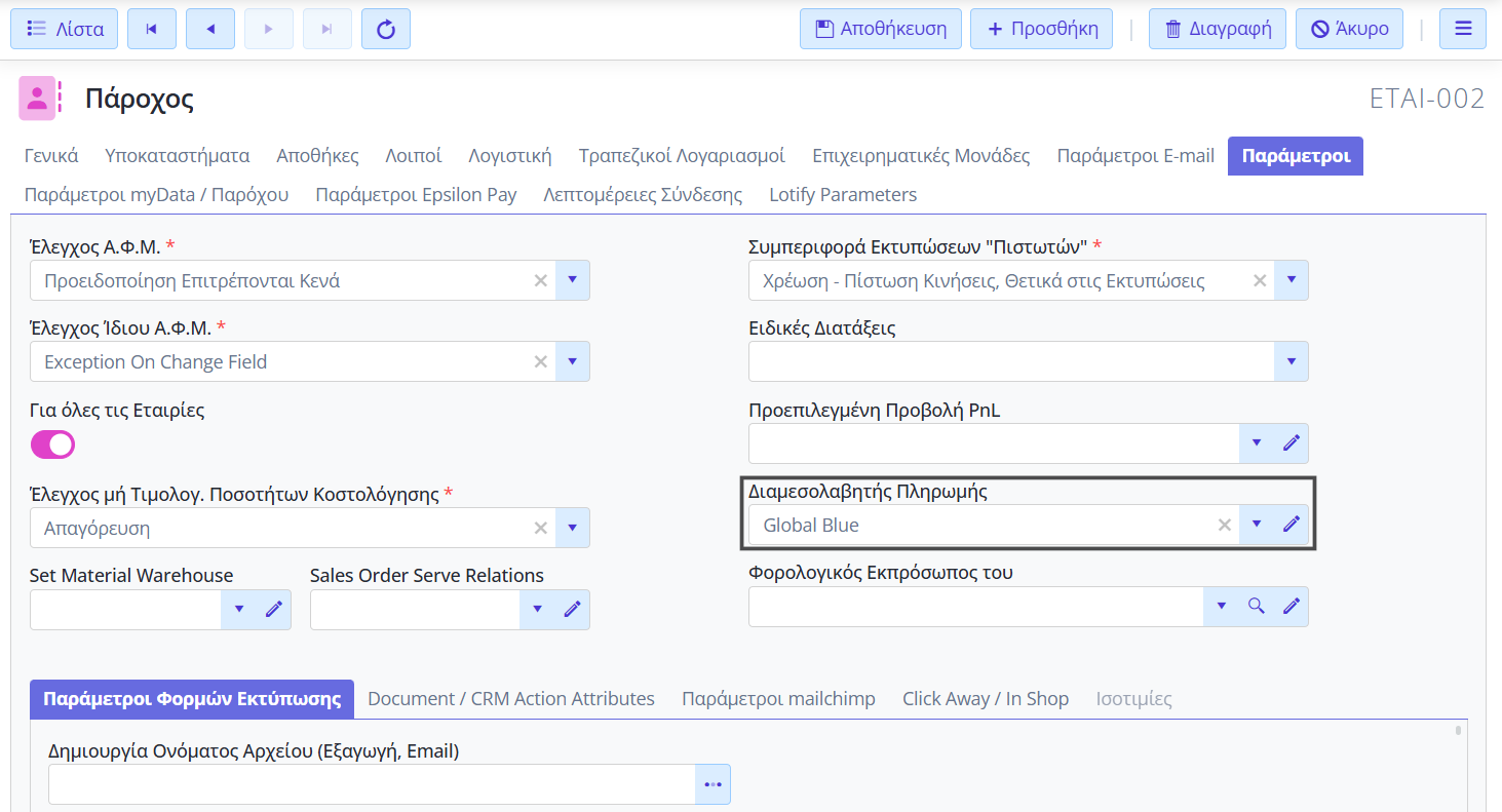 ⇒ Η Global blue ενεργοποιείται μόνο σε περιβάλλον παρόχου ηλεκτρονικής τιμολόγησης.