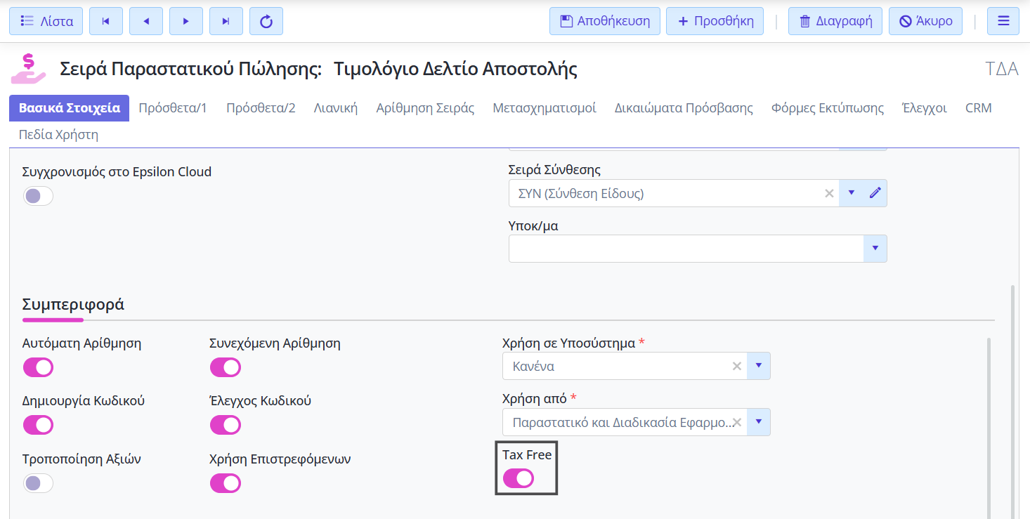 • ενεργοποιήστε το flag Tax Free στη Σειρά του Παραστατικού που θα συνοδεύεται με την αίτηση για tax free (tab Συμπεριφορά).