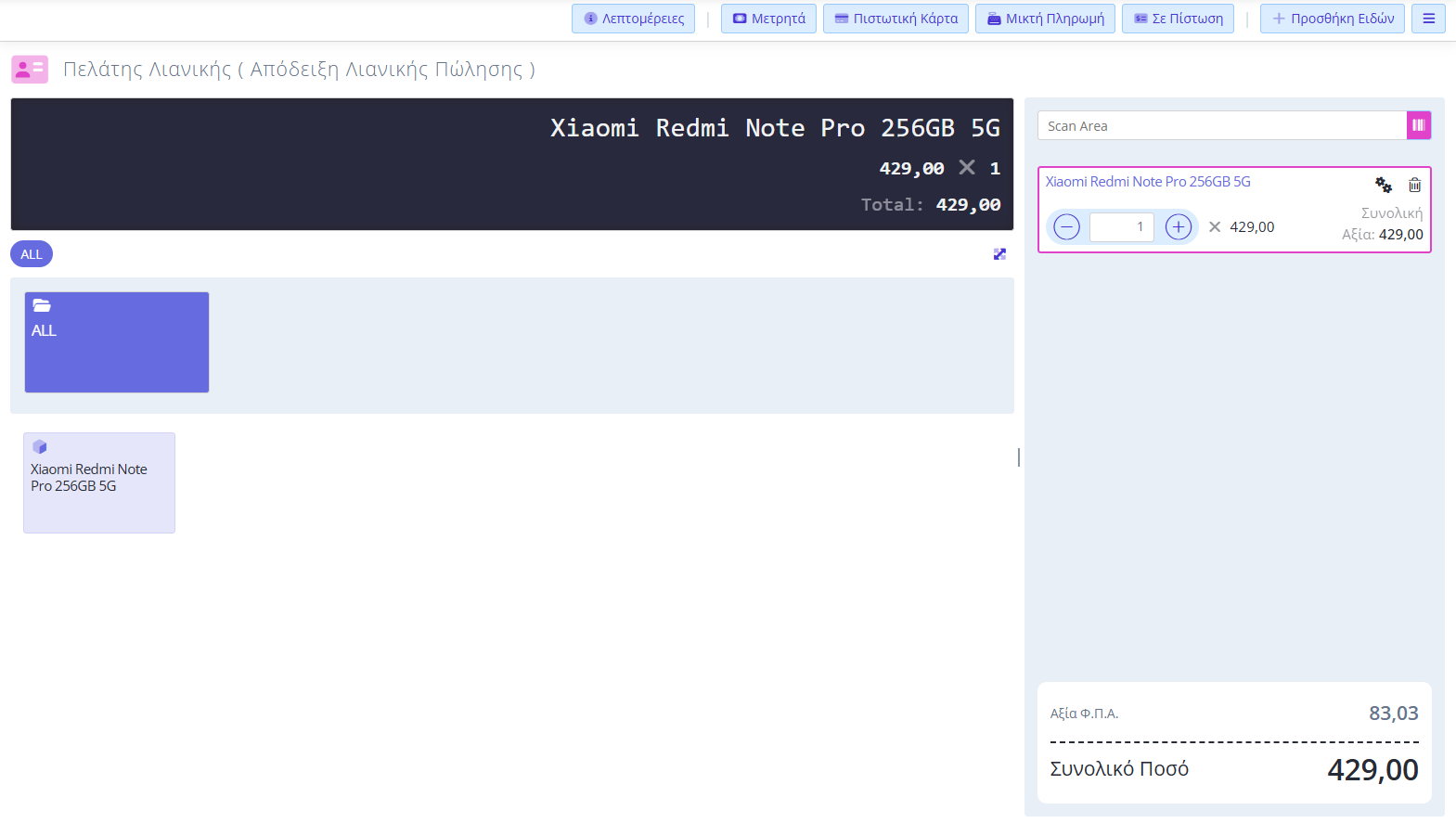 - Είδη, με δυνατότητα επιλογής μέσω της αναζήτησης, λίστας ή Barcode Scanner,