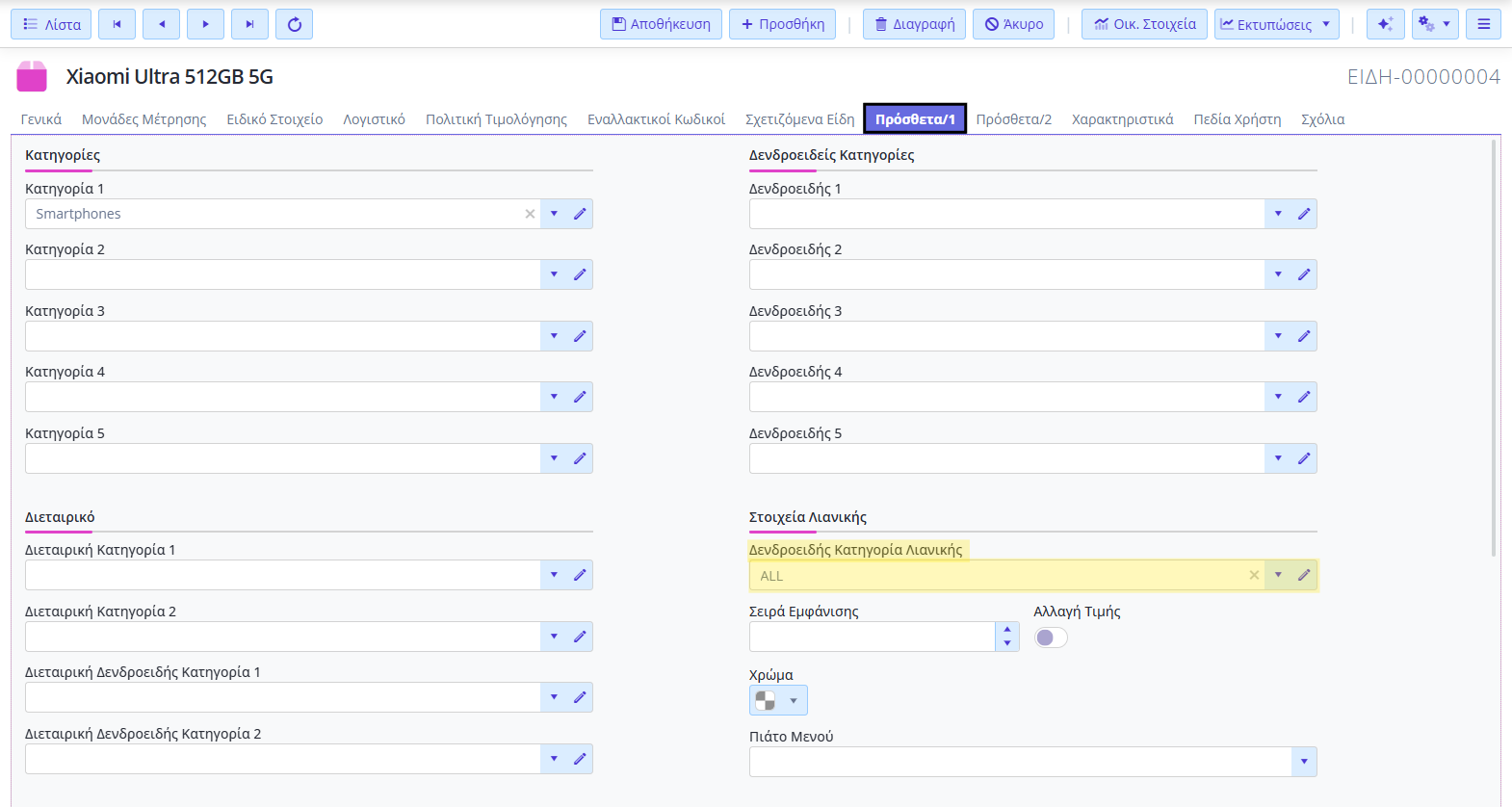 - Στα Είδη Αποθήκης, ορίζετε δενδροειδή κατηγορία λιανικής σε κάθε είδος. Στο tab Πρόσθετα 1 → περιοχή Στοιχεία Λιανικής, ορίζετε Δενδοειδή Κατηγορία Λιανικής.