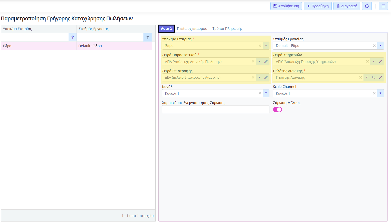Αφού πραγματοποιήσετε την παραπάνω παραμετροποίηση, έχετε ολοκληρώσει τη δημιουργία της οθόνης Γρήγορης Πώλησης Λιανικής (Κινήσεις → Πωλήσεις → Γρήγορη Καταχώρηση Πώλησης), η οποία θα έχει προεπιλεγμένα: