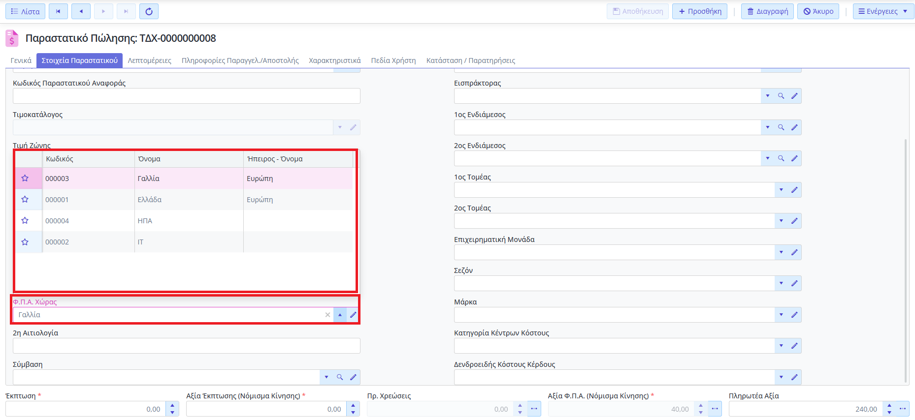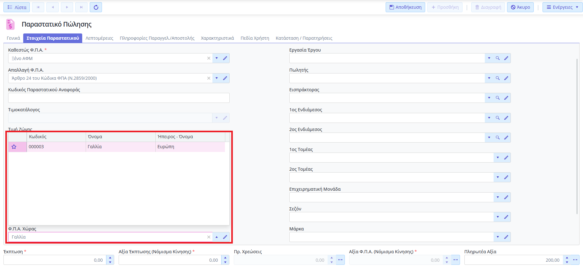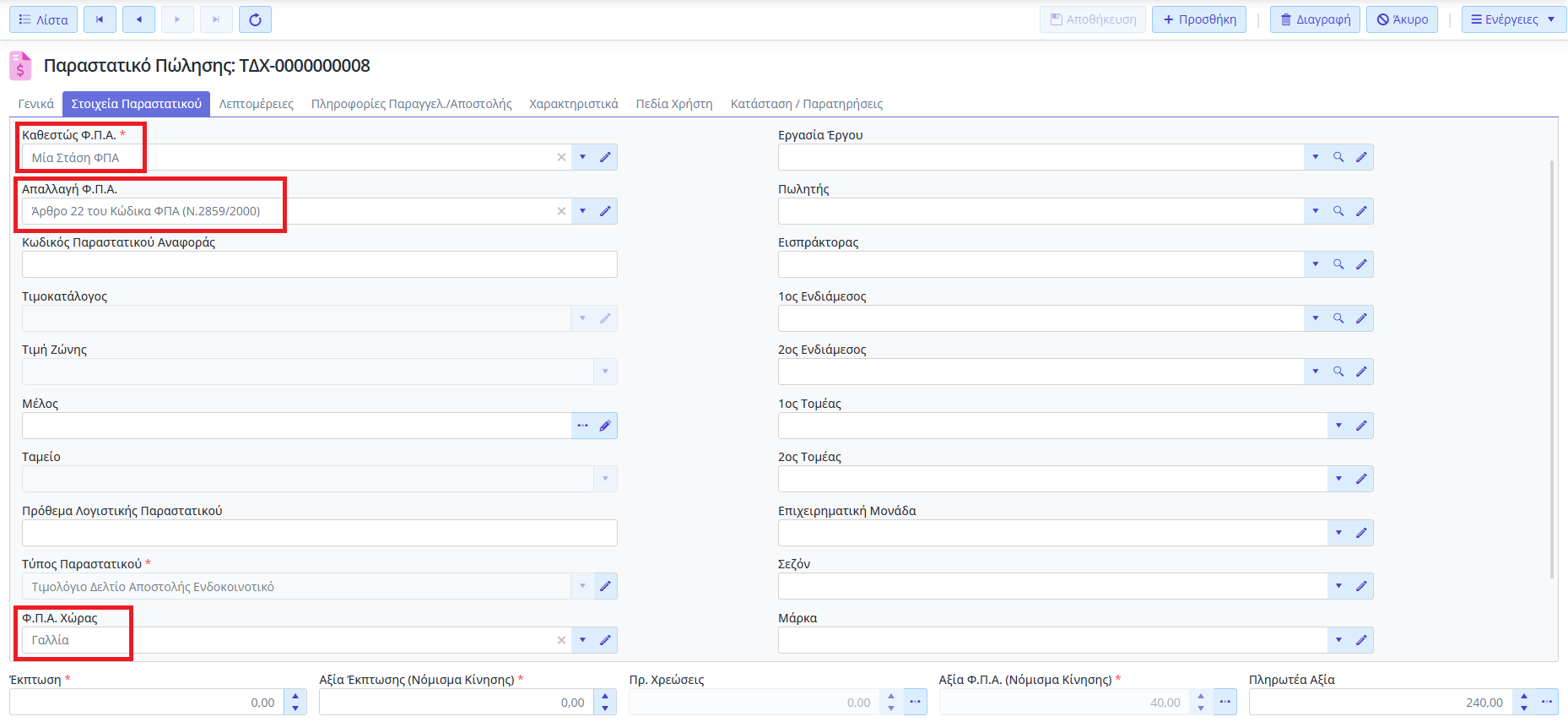 Στο tab Στοιχεία παραστατικού επιλέγουμε την αιτία εξαίρεσης ΦΠΑ και στο πεδίο Φ.Π.Α Χώρας την χώρα του τιμολογούμε στο δικό μας παράδειγμα την Γαλλία.