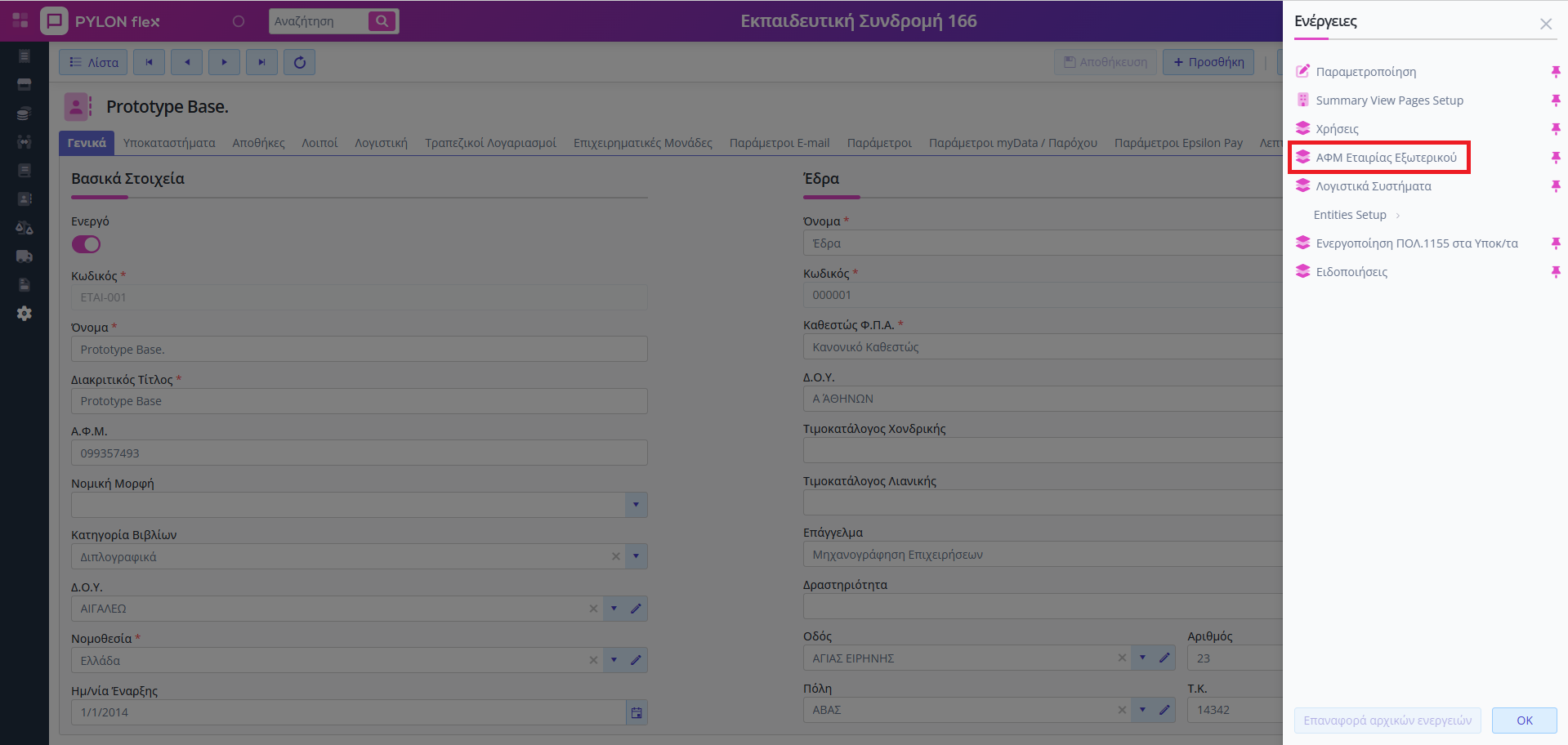 Στην περίπτωση που η εταιρεία του πελάτη μας έχει δικό της ΑΦΜ σε χώρα του εξωτερικού. Από το menu Οργάνωση – Υποδομή – Εταιρείες στις ενέργειες ορίζετε το ξένο ΑΦΜ.