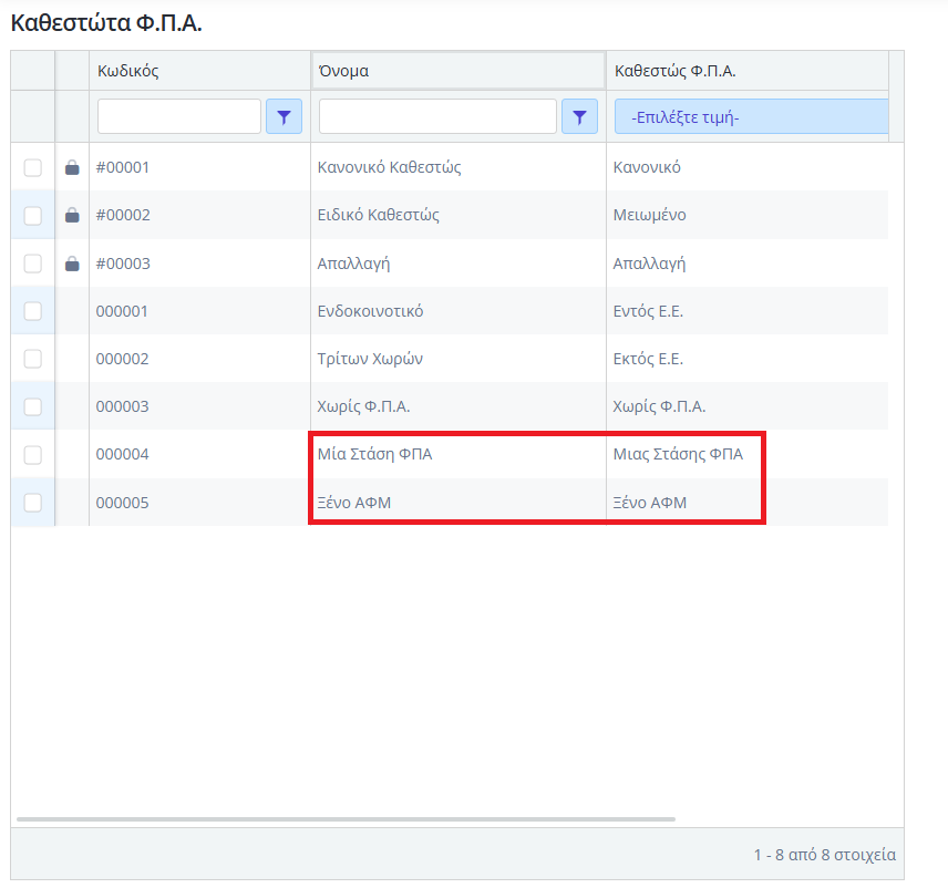 Αρχικά από το menu Οργάνωση – Υποδομή – ΦΠΑ – Καθεστώτα ΦΠΑ δημιουργείτε τα νέα καθεστώτα ΦΠΑ