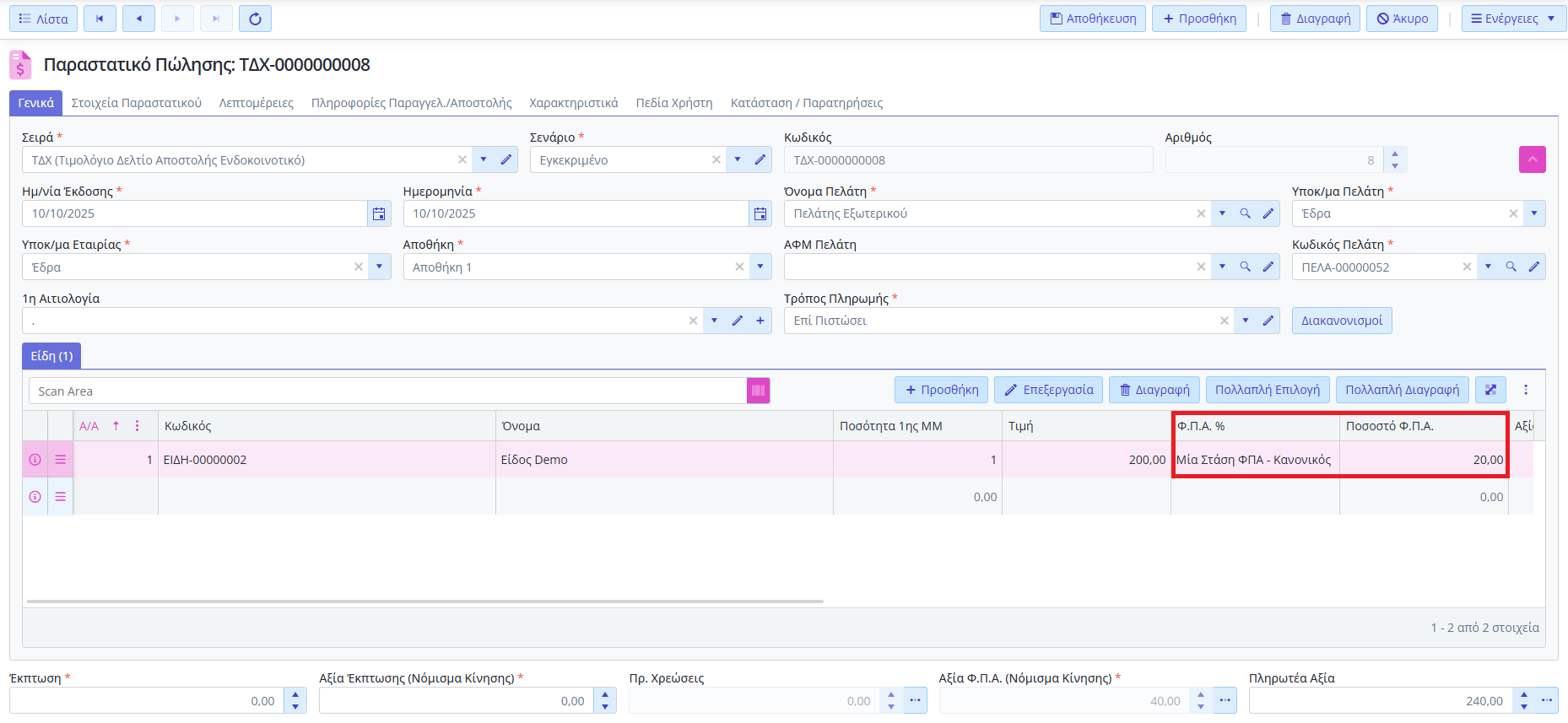 Βήμα 2ο : Στο παραστατικό πωλήσεων στις γραμμές των ειδών συμπληρώνουμε το ποσοστό ΦΠΑ της Γαλλίας π.χ 20%