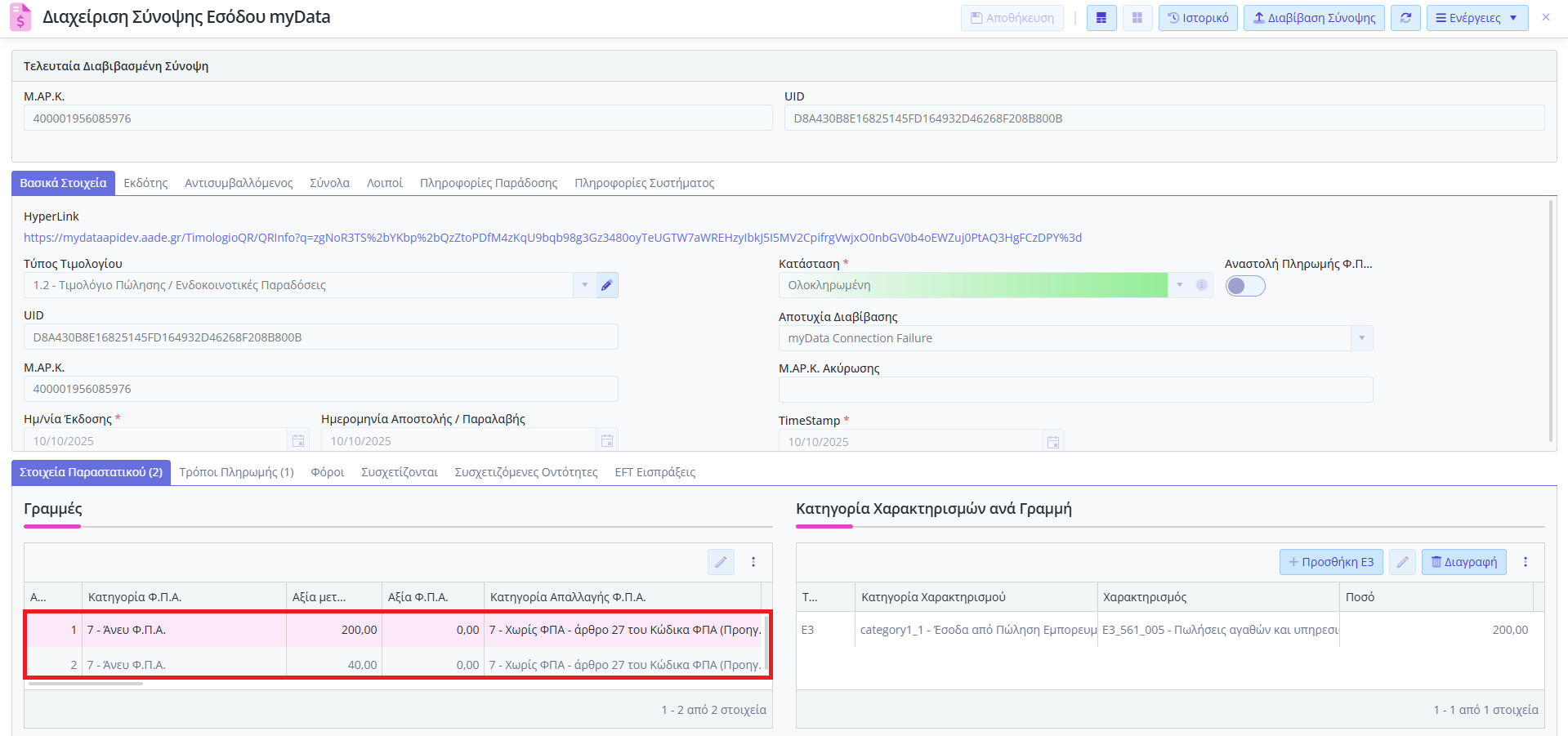 Η σύνοψη του παραστατικού έχει δύο γραμμές
