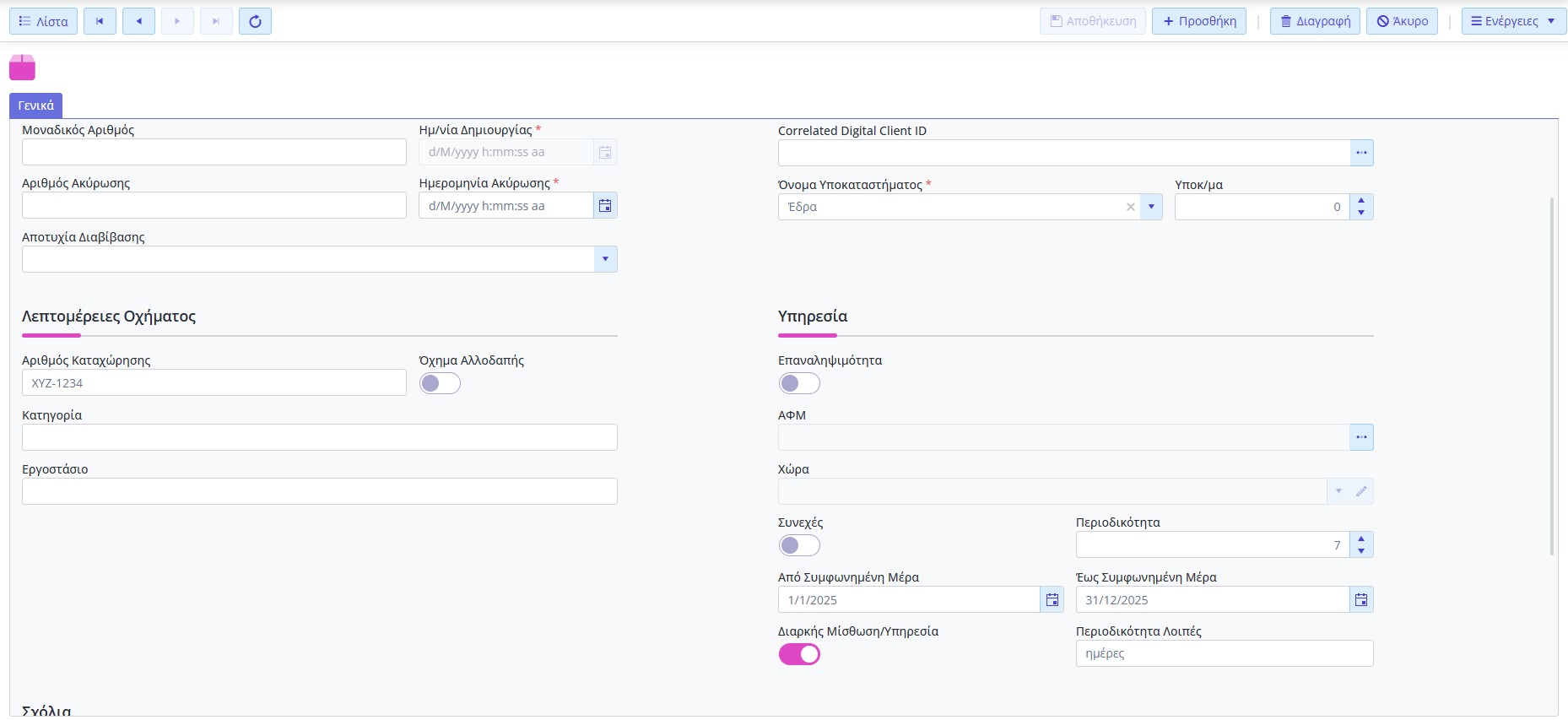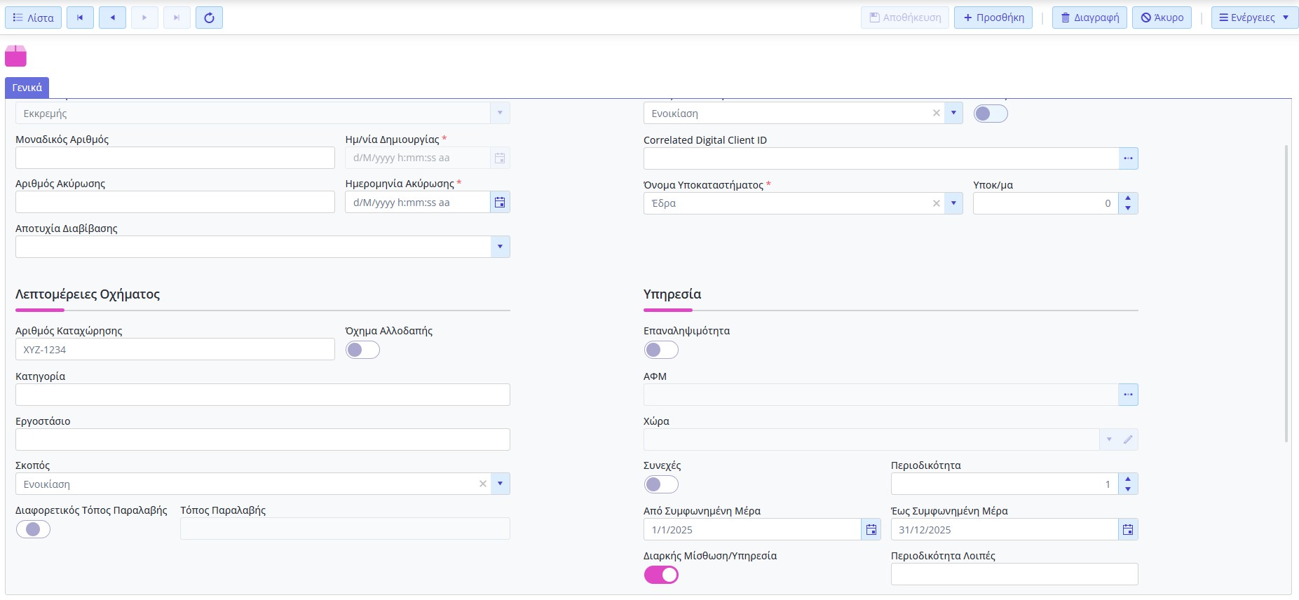 • Η επιχείρηση καταγράφει το σύνολο της μίσθωσης ως recurring service με έναρξη/λήξη.