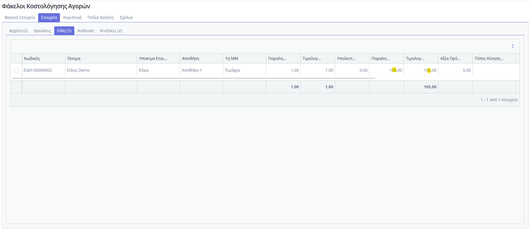Παραστατικό Αγοράς που περιλαμβάνει μεταφορικά έξοδα ή ασφάλιστρα και συμμετέχει σε φακέλους κοστολόγησης