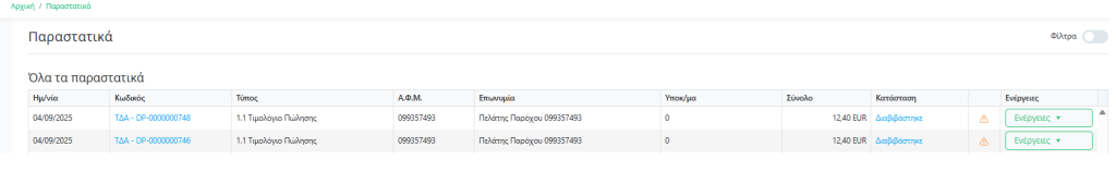 - Στο Epsilon Digital, η κατάσταση των παραστατικών έχει ενημερωθεί με την τιμή “Αδυναμία Διαβίβασης”