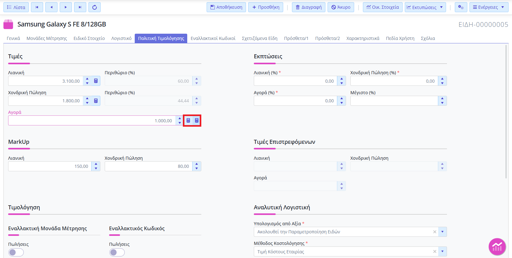 Μέσα από το είδος, στο tab Πολιτική Τιμολόγησης, ορίζετε: