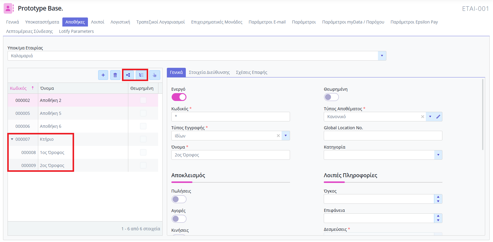 Με την επιλογή προσθήκη υποκόμβου έχετε την δυνατότητα δενδροειδούς απεικόνισης των υποχώρων-τμημάτων, για παράδειγμα υπάρχει ένας αποθηκευτικός χώρος, το κτίριο, το οποίο χωρίζεται σε δυο ορόφους.