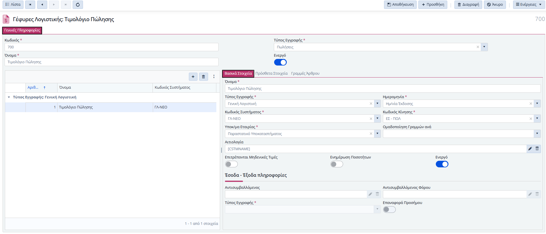 • ενεργοποιήστε το flag Φόρος για να χαρακτηρίσετε την γραμμή ως φόρο,