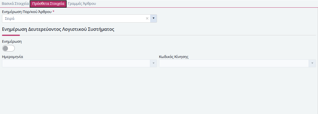 ⇒ Τα πεδία της περιοχής Ενημέρωση Δευτερεύοντος Λογιστικού Συστήματος ενεργοποιούνται μόνο εφόσον παρακολουθείτε δύο λογιστικά συστήματα και ενεργοποιήσετε το flag Ενημέρωση.