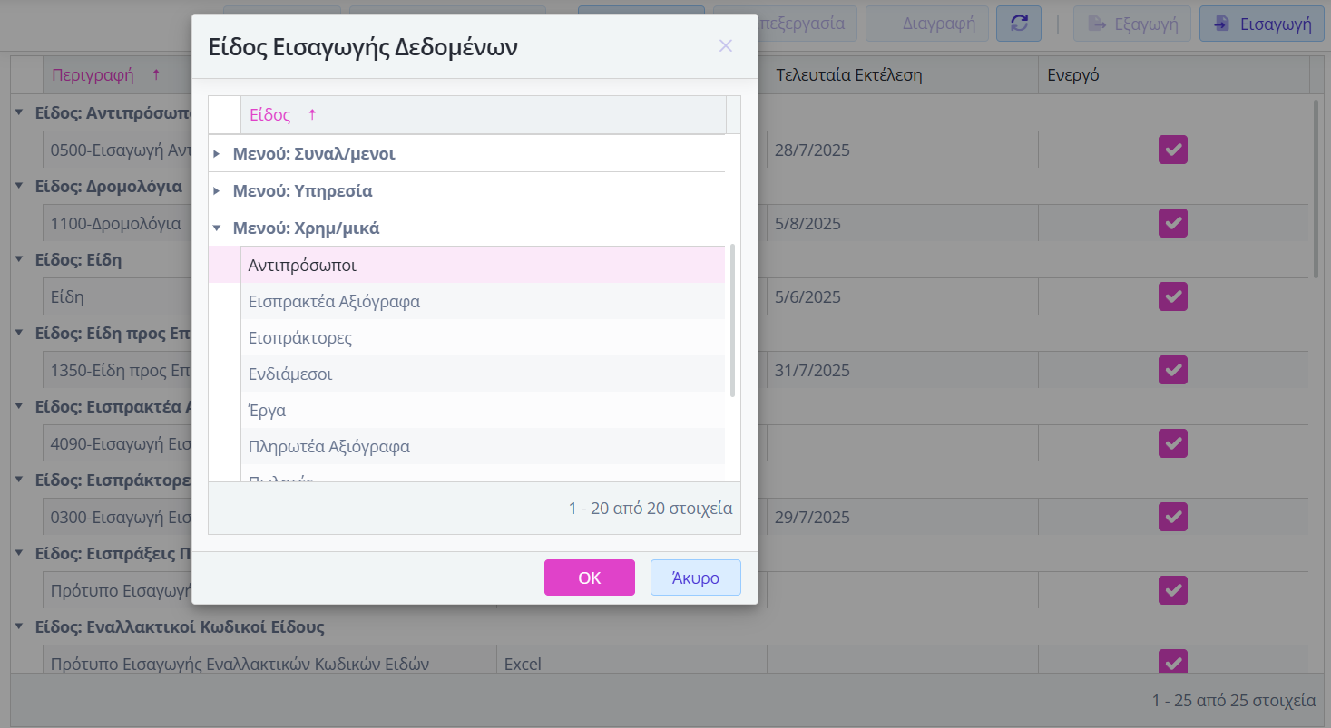 Για να πραγματοποιήσετε την εισαγωγή του αρχείου αντιπροσώπων στην εφαρμογή, θα πρέπει να δημιουργήσετε ένα σενάριο εισαγωγής. Εργαστείτε ως εξής:
