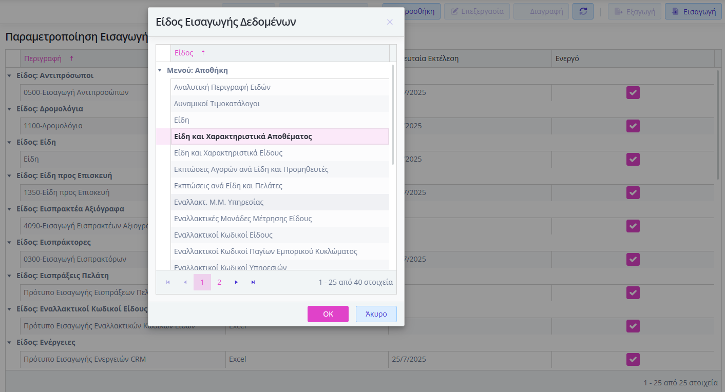 - επιλέξτε στο pop up παράθυρο που θα εμφανιστεί Μενού: Αποθήκη → Είδη και Χαρακτηριστικά Αποθέματος και πατήστε ΟΚ,