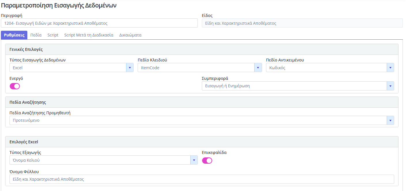 Για να πραγματοποιήσετε την εισαγωγή του αρχείου ειδών με χαρακτηριστικά αποθέματος στην εφαρμογή, θα πρέπει να δημιουργήσετε ένα σενάριο εισαγωγής. Εργαστείτε ως εξής: