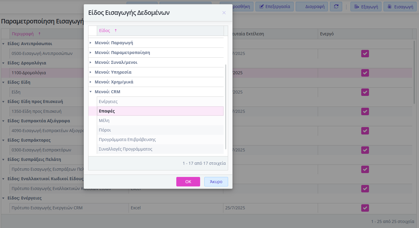 - επιλέξτε στο pop up παράθυρο που θα εμφανιστεί Μενού: CRM → Επαφές και πατήστε ΟΚ,