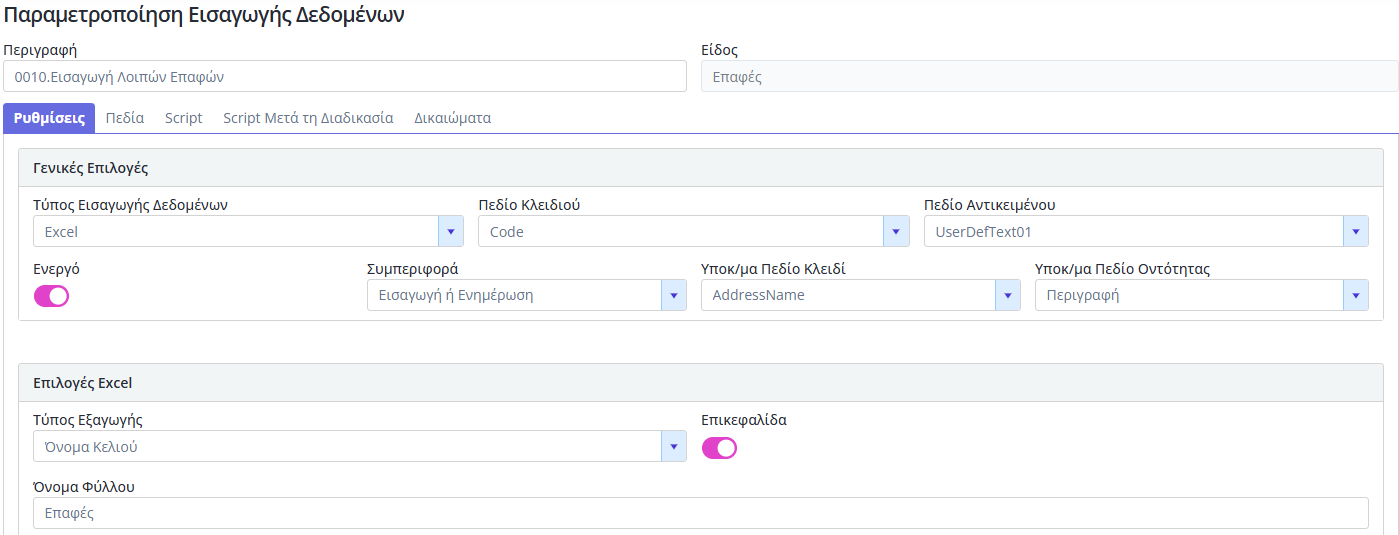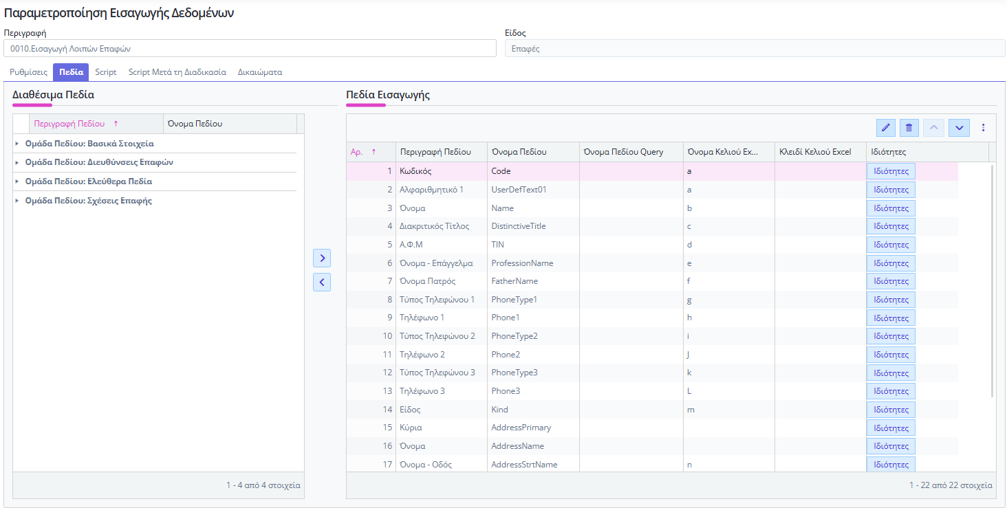 ⇒ Το σενάριο έχει δημιουργηθεί σύμφωνα με το πρότυπο αρχείο excel και περιέχει όλα τα πεδία, αντιστοιχισμένα με την εκάστοτε στήλη του αρχείου.