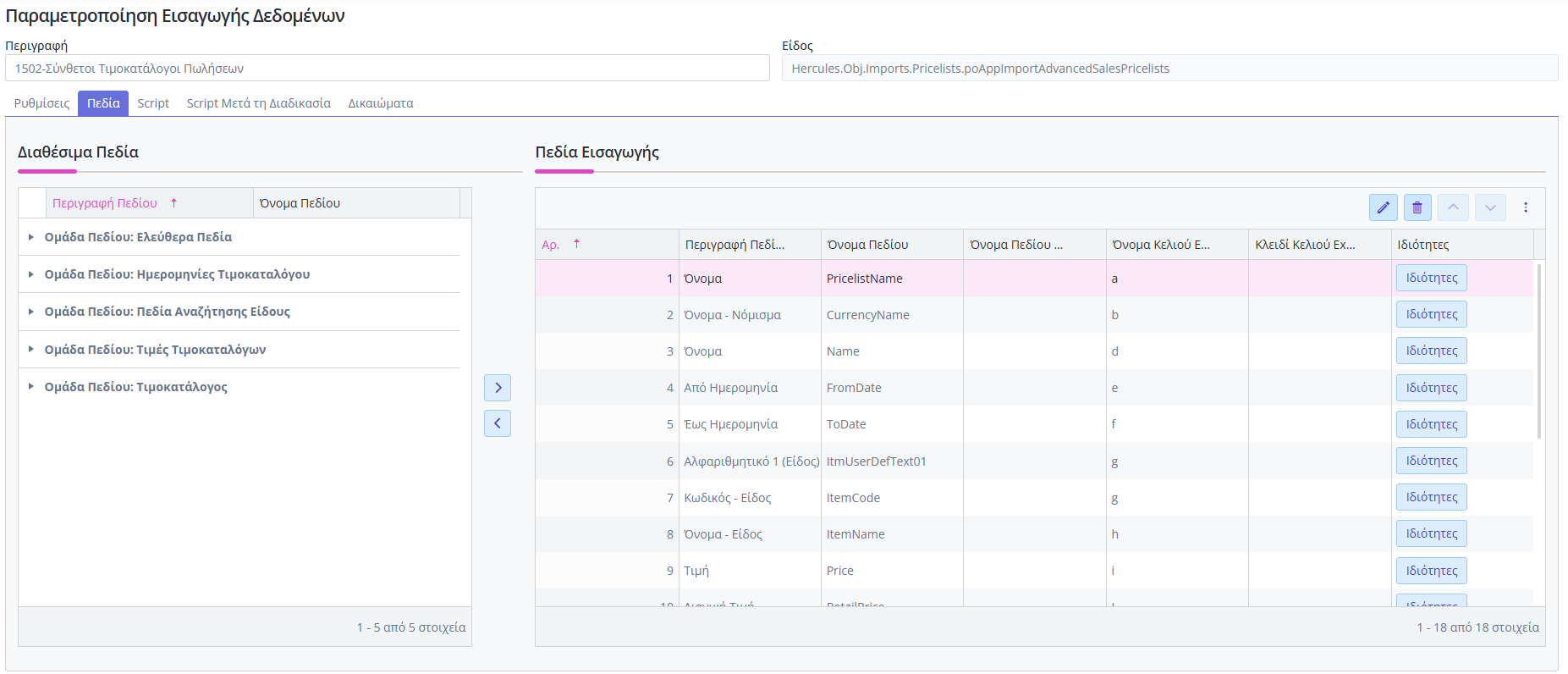 Το σενάριο έχει δημιουργηθεί σύμφωνα με το πρότυπο αρχείο excel και περιέχει όλα τα πεδία αντιστοιχισμένα με την εκάστοτε στήλη του αρχείου.