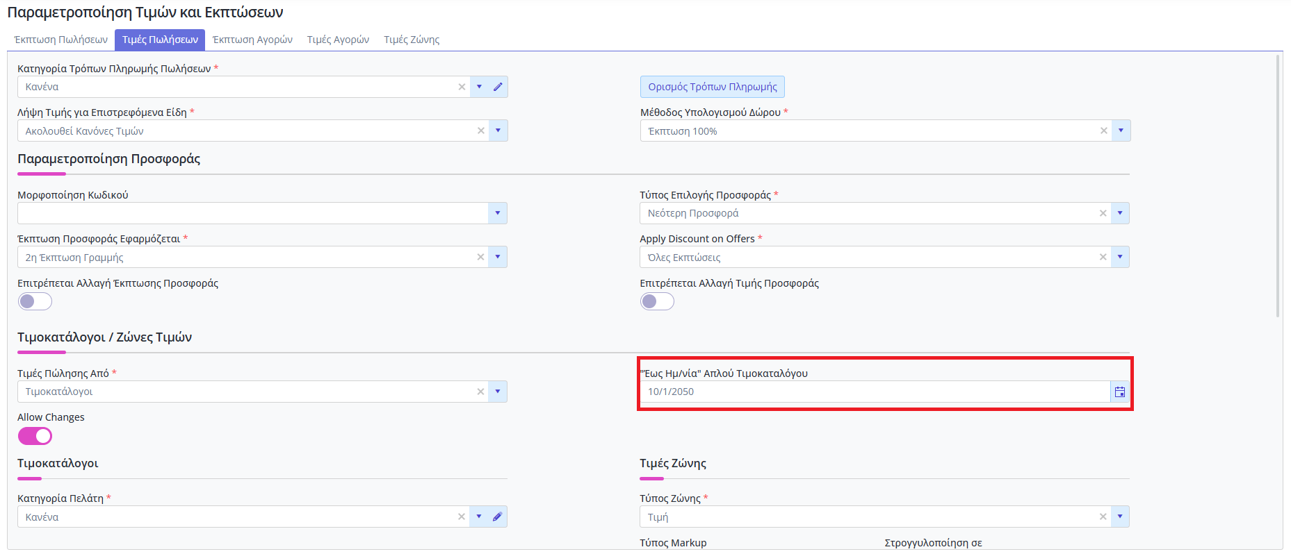 Η χρονική ισχύς στους απλούς τιμοκαταλόγους ορίζεται από το μενού Οργάνωση → Εμπορικό → Εκπτώσεις/Τιμές Παραμετροποίηση, και ισχύει για όλους.
